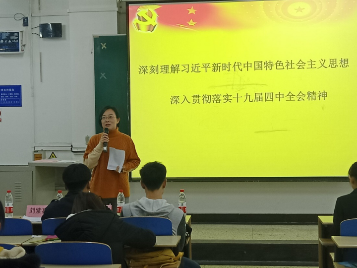 李珊珊带领同学们回顾了中华人民共和国成立70周年来的艰辛历程,通过生动的例子将老一辈革命者、科研工作者的事迹娓娓道来,使同学们铭记历史,激发爱国热情。她向同学们深入解读十九届四中全会精神,阐释中国特色社会主义制度和国家治理体系的“十三大显著优势”,强调制度的重要性,列举十九届四中全会《决定》提出建立的一系列制度。最后,她提出希望,作为新时代的青年人,大家既是见证者,更是建设者与参与者,要充分利用大学的时间,做好人生规划,坚定“四个自信”,为实现中国“两个一百年”奋斗目标而努力奋斗,做勇担民族复兴大任的时代新人。
