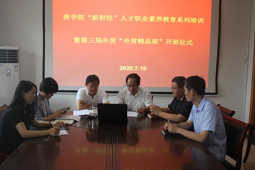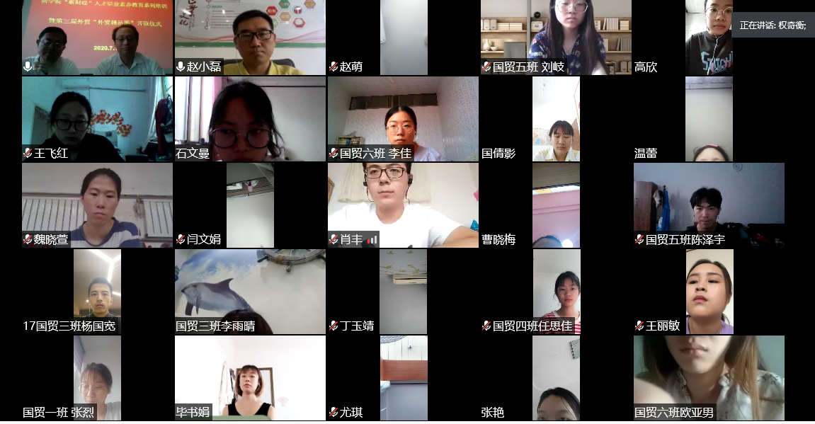 7月10日上午,商学院举办“新财经”人才职业素养教育系列培训暨第三届外贸精品班开班仪式视频会议。河北省商务厅外贸处原处长权奇衡、河北爱德会展服务有限公司高级顾问崔翔勇、外贸实践领域管理专家和商学院班子成员、部分教师及国际经济与贸易专业学生参加。会议由崔翔勇和商学院党委副书记侯彦利共同主持。