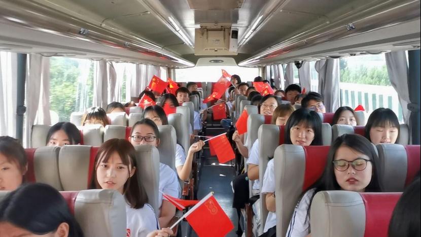 上午八点,同学们怀着无比激动的心情在第三办公楼下集合完毕并举行出征仪式。在前往西柏坡的路途中,同学们表演了《名字叫中国》手势舞,合唱了《没有共产党就没有新中国》、《团结就是力量》、《追梦赤子心》等红色歌曲。歌声嘹亮,红旗舞动,同学们的脸上洋溢着浓浓的爱国情,在欢声笑语中到达目的地。