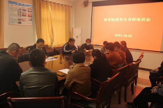 10月25日,商学院在学院西会议室召开2021年度研究生导师培训会。学院十余位新聘导师参加了本次会议。会议由商学院副院长刘振滨主持,商学院党委书记马兵林参加会议并讲话。