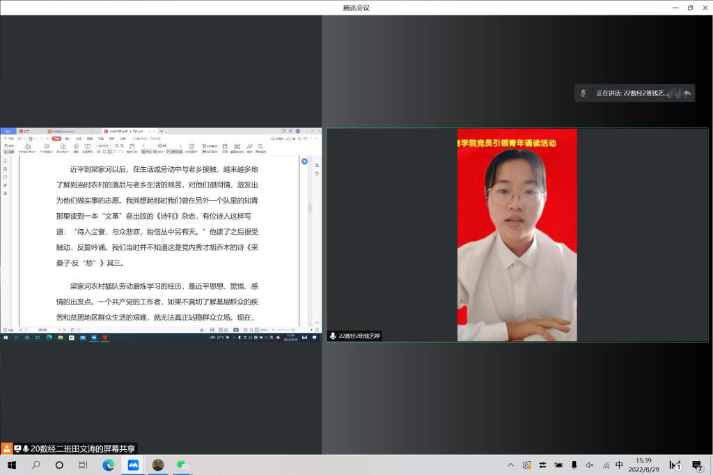 8月29日下午,商学院在线上举办“学‘习’经典,踔厉奋发”党员引领青年诵读活动,学院2022级新生辅导员、10名优秀学生党员代表和2022级全体新生参加了此次活动。