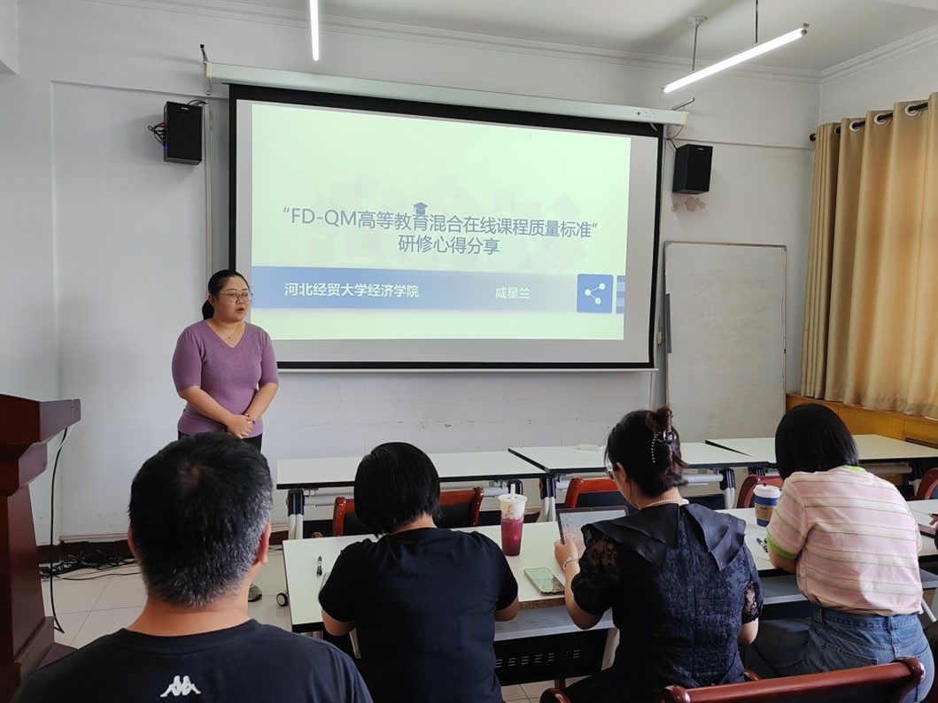 咸星兰老师从“FD-QM高等教育混合在线课程质量标准”项目介绍、FD-QM标准解读、基于FD-QM标准的混合课程建设三个方面进行了研修心得分享。