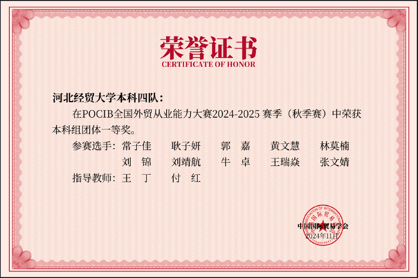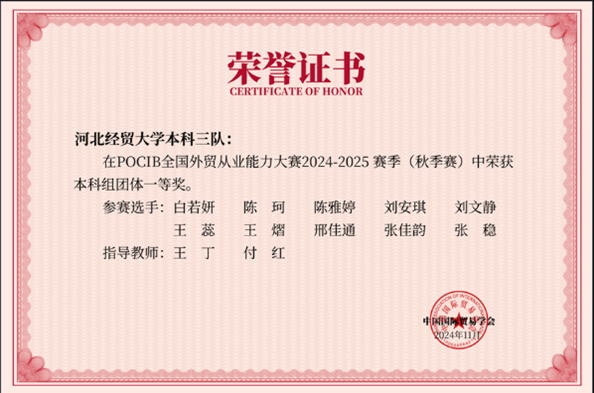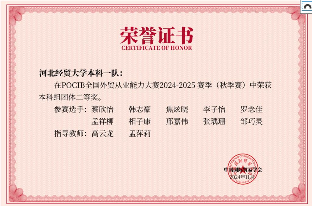 2024年11月7日至11月19日,由中国国际贸易学会主办、全国外经贸职业教育教学指导委员会为技术指导单位、中国国际贸易学会培训处和南京世格软件有限责任公司承办的“第十四届POCIB全国外贸从业能力大赛(秋季赛)”在网上开赛,本次大赛共有310所院校、992支队伍、共计9920名选手参加。我校代表队由太阳成tyc33455cc国际贸易系高云龙、孟萍莉、王丁和付红四位老师和2022级国际经济与贸易专业40名学生参加了本次大赛。在长达13天马拉松式的赛程中,在指导老师不辞辛苦指导和学生团队顽强拼搏下,最终高云龙和孟萍莉指导一队、二队分别荣获团体二等奖、团体一等奖;王丁和付红老师指导的三队和四队均荣获团体一等奖。