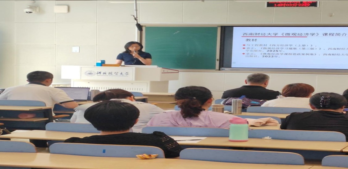 赵燕老师从西南财经大学《微观经济学》的课程简介、课程特色、课程经验借鉴及改进措施三个方面分享了参加中西部高校青年教师融合式教学研修心得。赵燕老师介绍指出,西南财经大学的《微观经济学》课程的教材体系完整,课程设计合理,考评方式先进,通过课堂网络签到、习题嵌入、授课时长等环节精心设计,有效提升了课堂教学质量。其次,该课程教学基于学生学习能力和学习方式,灵活调整授课范围和深度、习题难度,尤其是课堂教学融合了教师自编习题集和案例集,显著提升了学生探究式学习能力。再次,该课程仍重视以授课为主的传统教学方式,不断增强学生课堂参与式学习比重,重视学生逻辑思维训练。最后,赵燕老师结合我院课程教学特点,总结了西南财经大学《微观经济学》课程教学的可借鉴之处及我院课程教学的改进建议。