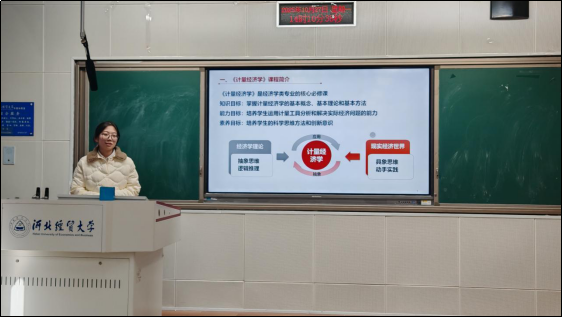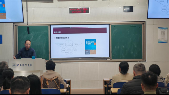 韩梦莹老师代表数字经济学教学团队汇报课程成果。团队明确以“价值释放”为核心,围绕生态逻辑、数字商业模式、数字价值化展开教学,构建了“双驱动三阶段四维度”教学体系。具体实践中,通过给学生分配项目、结合案例分析评价能力重构教学设计,同时将课堂知识与学科竞赛结合,建设数据库与AI辅助教学系统,开发B站线上资源,组织小组讨论与课后任务,强化学生协同合作能力,课程创新不局限于知识传授,更注重综合素养培养,团队还成功申报省级教研教改项目,取得显著教学成效。