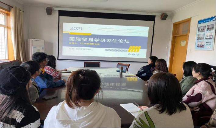 2021年10月22日下午,商学院国际贸易学专业2020-2021级全体学生在第三办公楼405室举办了主题为“国际贸易学研究生论坛”的学术沙龙,活动内容主要是由研二学生进行学术汇报,研一学生参与聆听并学习。
