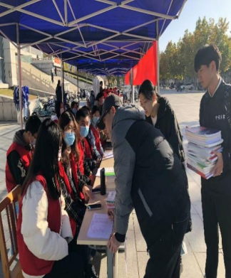 11月13日上午,同学们来到图书馆广场指定地点,在志愿者的引导下对图书进行分类同时完成相关信息的登记工作。除此之外,同学们还同志愿者就书籍捐赠情况进行交流并合影留念。