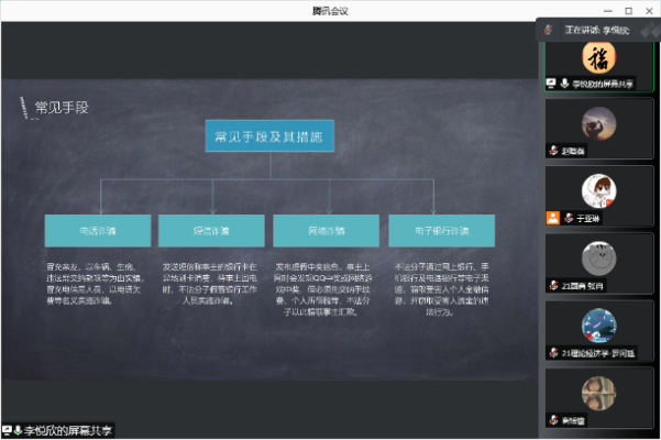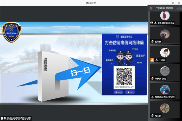 罗河廷等12名同学根据现实案例和公安机关“反诈APP”宣传材料、结合自身经验,从电信诈骗、网络诈骗、贷款诈骗、冒充国家机关工作人员诈骗等角度出发做了“反诈知识”相关分享。本次在线会议充分利用了视频、音频、言语解说等多种形式,生动形象地对诈骗的概念、形式、经典案例、“反诈”方法等做了科普。
