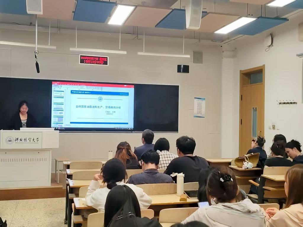 第三,王晴同学分享了《金砖国家油脂油料生产、贸易格局分析》这一文献。王同学首先对金砖国家油脂油料的生产及消费情况、植物油的生产和消费情况、油料进出口情况、植物油进出口情况进行了说明和分析,并针对中国从金砖国家进口油脂油料和植物油的情况进行了详细的阐述;其次概括出金砖国家油脂油料未来的合作潜力,包括土地资源与农业生产潜力、农业贸易结构与合作潜力;最后,提出要深化中巴农业合作、提升金砖国家农业贸易稳定性与便利性、推动金砖国家合作助力当地农业发展这三条政策建议。