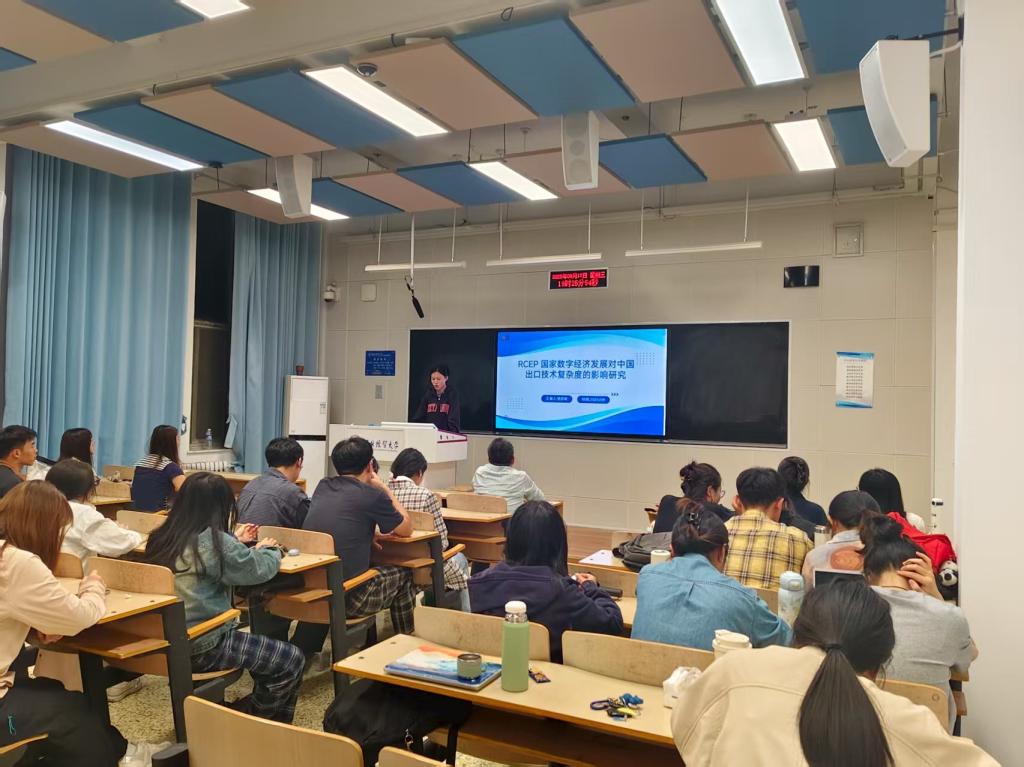 第四,范欣雨同学分享了一篇名为《RCEP国家数字经济发展对中国出口技术复杂度的影响研究》的文章,并从研究背景与问题、研究目的与创新点、研究方法与实验设计、主要结果与结论等方面进行介绍。首先,该同学对本文的研究背景作了简单介绍。数字技术的飞速发展,正在深刻改变全球生产、交换、分配和消费模式,推动全球经济进入数字化转型的新阶段。而中国面临着出口技术复杂度提升的需求,RCEP区域合作正为此提供了机遇。文章实证检验2010-2022年RCEP成员国数字经济发展对中国出口技术复杂度的整体影响及内在机制。研究发现:RCEP成员国数字经济发展对中国出口技术复杂度存在显著促进作用,并且这一促进作用主要通过RCEP国家经济发展水平、贸易开放度、人口规模等路径起作用。