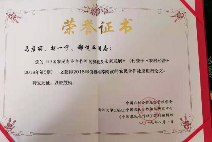 据悉,马彦丽教授与胡一宁、郗悦平合作社的论文《中国农民合作社的异化和未来》(刊登于《农村经济2018第5期》)获得2018年值得推荐阅读的农民合作社应用型论文。