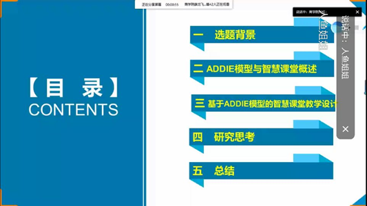 首先,付红老师分析了智慧课堂出现的背景。智慧课堂是为适应数字信息时代学生群体的转变、借助智能教学工具的普及以及在《教育信息化2.0行动计划》政策引领下破茧而出。其次,在简要介绍了ADDIE模型、智慧课堂教学设计内涵及智慧课堂的类型之后,结合ADDIE模型构建智慧课堂教学设计的“吸收、设计、开发、实施、评估”五个阶段,对比分析了智慧课堂教学设计与传统课堂教学设计的区别,重点阐述了由“教学组织、教学技术、教学形式、教学策略”构成的教学设计和“课前、课后、课中”三阶段构成的实施阶段。第三,付老师总结有关智慧课堂国内外研究的成果并基于“智慧课堂构建中的现实困境、智慧课堂教学的风险及防范、智慧课堂中学生激励机制及实施路径”等方面提出自己的教研思考。与会教师积极发言,现场气氛热烈。最后,马书刚副院长做总结发言。