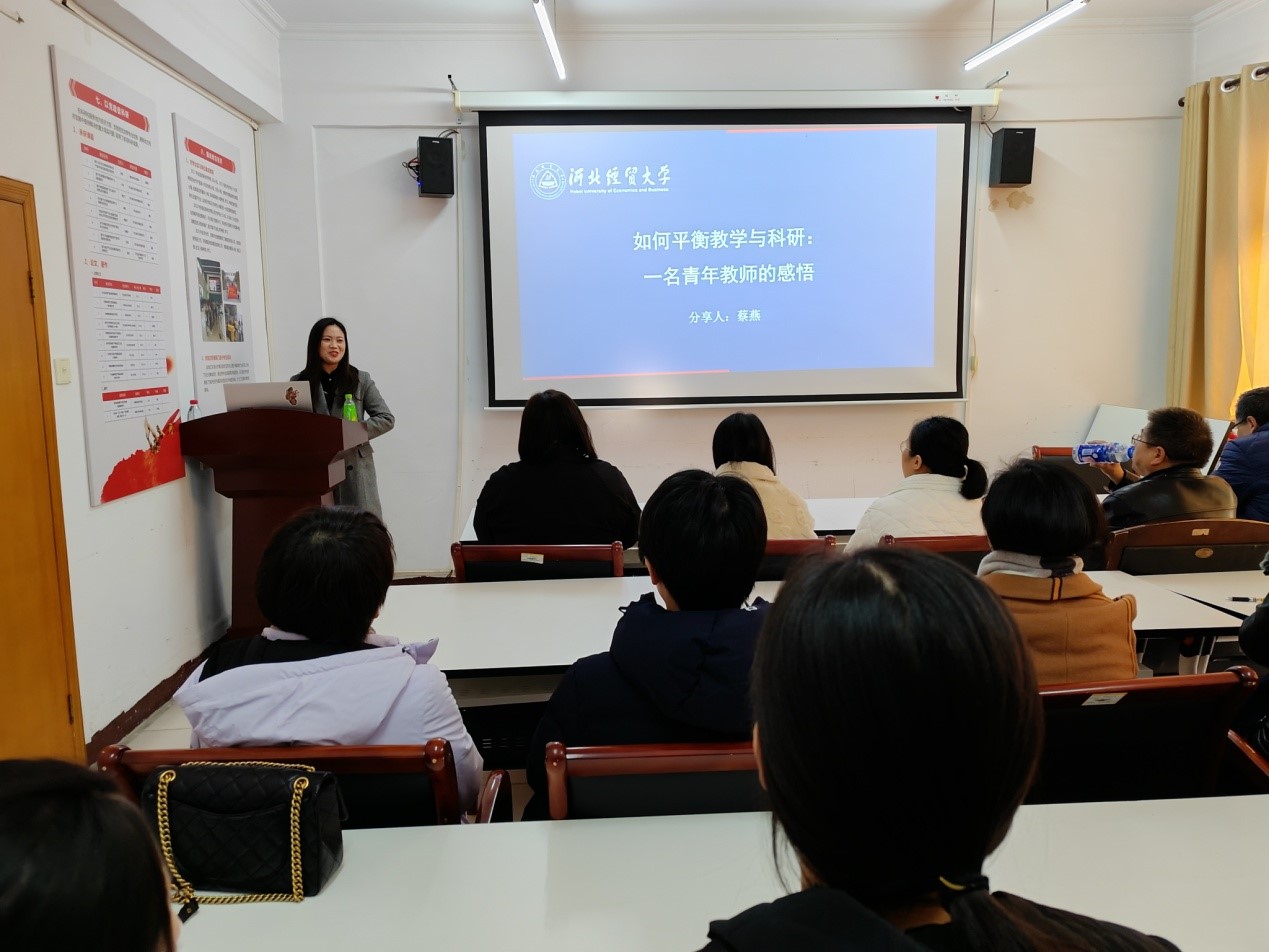 2023年11月13日下午,商学院在学院会议室举办了题为《如何平衡教学与科研:一名青年教师的感悟》教学沙龙活动。沙龙活动由国贸系教师蔡燕主讲,全校40余名教师参加。