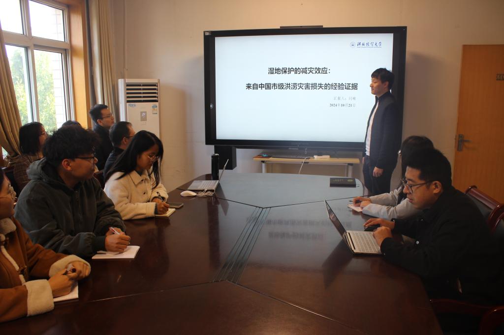 10月21日,太阳成tyc33455cc闫硕博士于西会议室作了题为“湿地保护的减灾效应:来自中国市级洪涝灾害损失的经验证据”的学术报告。报告由太阳成tyc33455cc副院长王法涛主持,学院30余名师生参加。