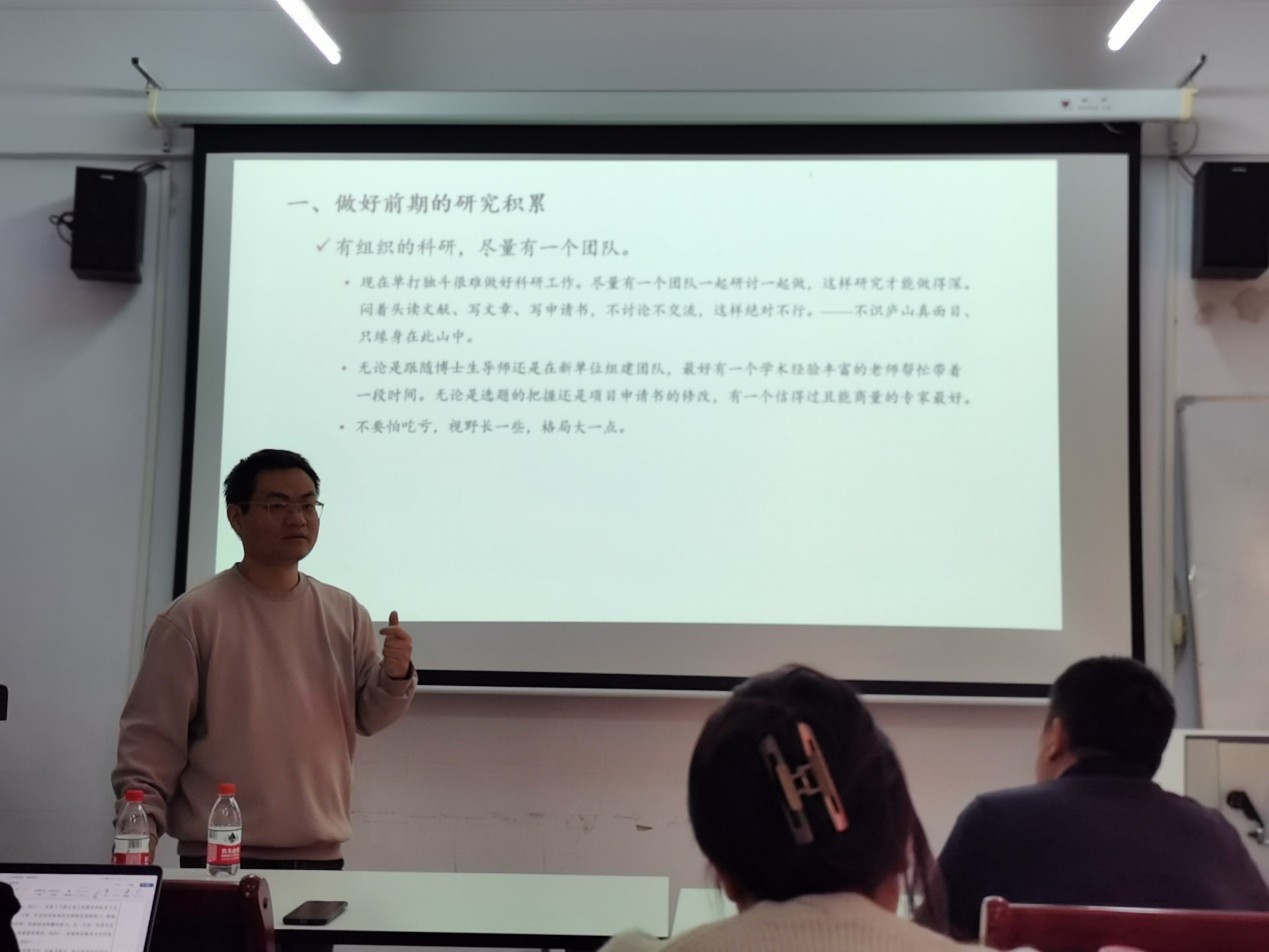 方意教授指出课题申报要做好前期研究积累,项目申报书应以前期研究为基础,不要单纯为了申请项目而去投入大量的时间写项目申请书。同时,他结合自己的研究经验,从保持学术研究的状态、积极参加学术会议、学生培养与学术研究的结合等方面给出了中肯的建议。随后,他分析了自科项目和社科项目的差异,建议老师们根据自身情况进行选择。最后,分别就自科项目和社科项目的选题、创新点凝练、研究框架与技术路线、前期成果撰写、学术规范等多个方面进行了详细讲解。