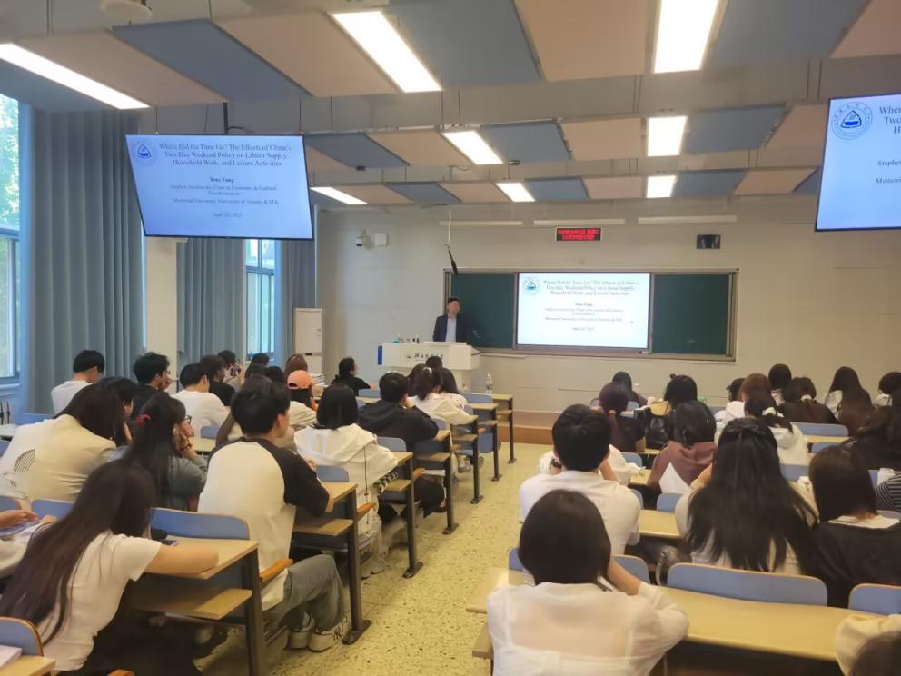 4月29日,太阳成tyc33455cc邀请纽芬兰纪念大学方涛教授在第三教学楼作了题为“时间去哪儿了?中国双休日政策对劳动力供给、家务劳动和休闲活动的影响”的学术报告。报告由王法涛副院长主持,我校百余名师生参加。