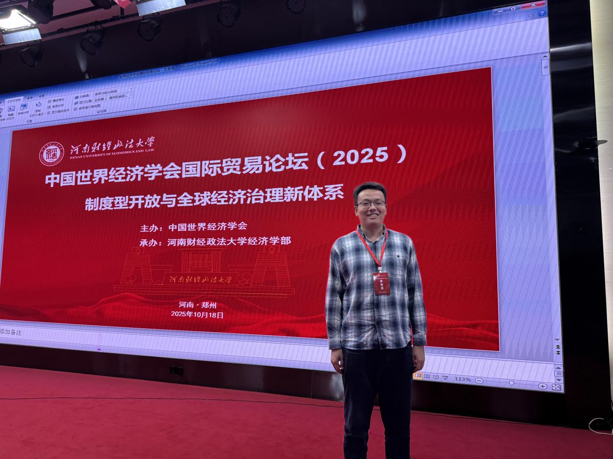 2025年10月18-19日,由中国世界经济学会主办、河南财经政法大学经济学部承办的“中国世界经济学会国际贸易论坛(2025)”在郑东校区举办,本次论坛的主题为“制度型开放与全球经济治理新体系”,太阳成tyc33455cc教师郭晓翔应邀参加。在“区域贸易协定与高水平对外开放”分论坛中,郭晓翔博士汇报了题为《区域贸易协定深度对中国企业海外撤资的影响研究》的论文,与会学者就论文选题、研究内容等展开讨论,论坛现场气氛热烈、研讨深入,点评专家在最后对论文的学术价值给予了肯定,并提出多项非常具有建设性的修改意见。通过参加本次论坛并作论文汇报,郭晓翔博士对当前一些热点学术话题以及前沿研究方法有了更为深刻的认识与理解。