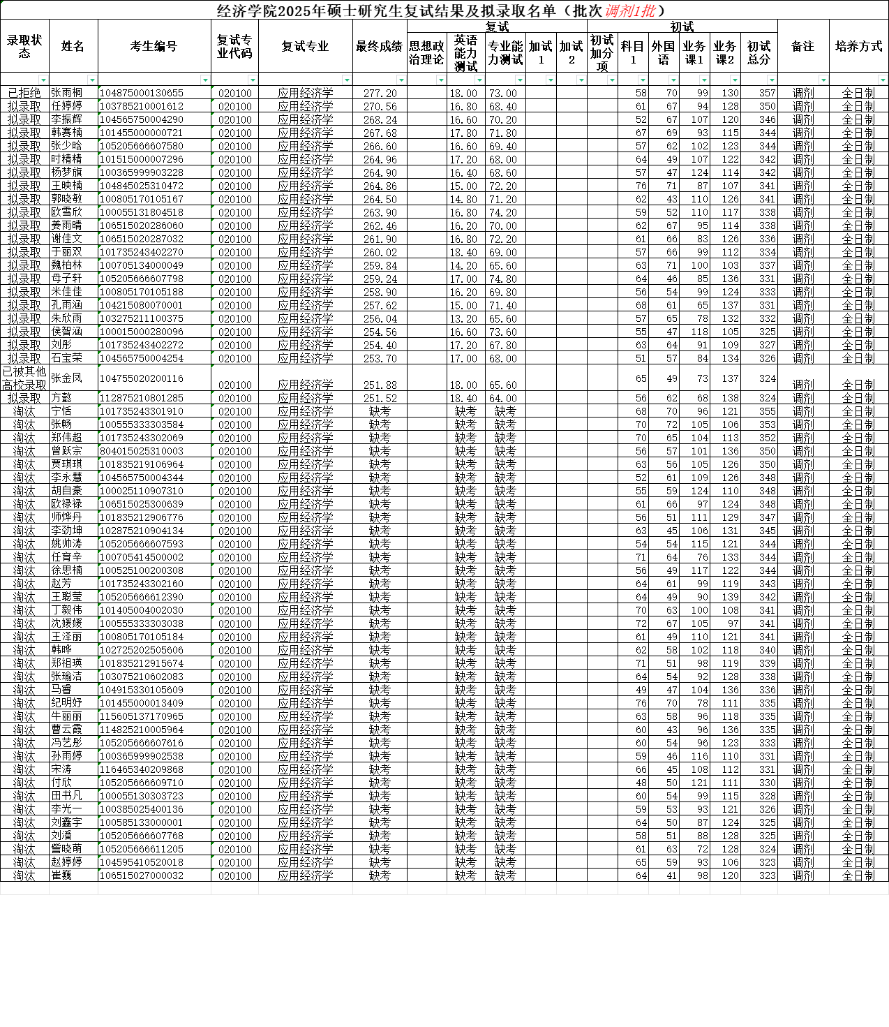 太阳成tyc33455cc2025年硕士研究生复试结果及拟录取名单(批次调剂1批)