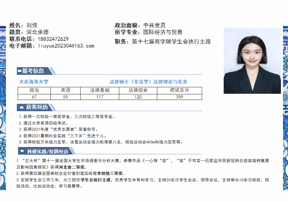 刘悦学姐是一名跨专业考生,她提醒同学们要关注复试科目以及分数占比。在政治学习方面,除去课程、书籍的推荐,刘悦学姐也推荐了一个微信小程序——苍盾;在英语学习方面,点明了单词和精准翻译的重要性;在法律学习方面,她指出背的内容虽然很多,但也要注意灵活运用。