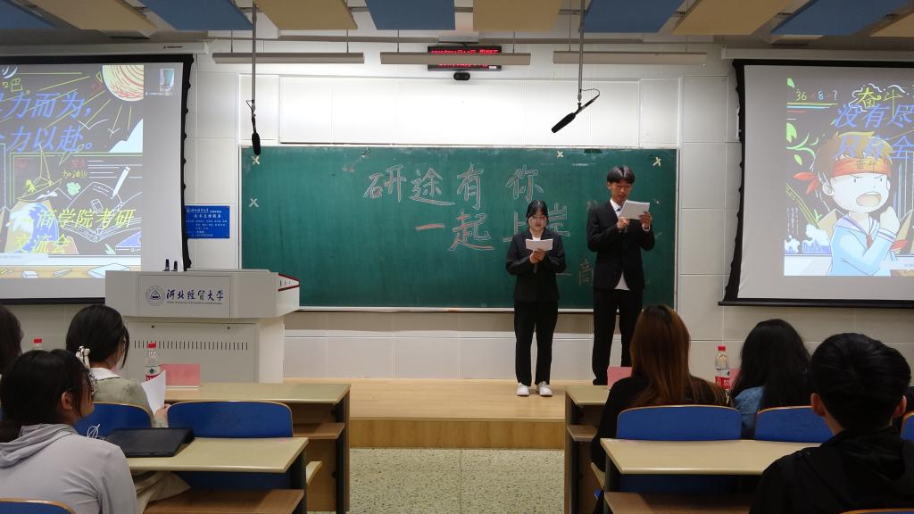 4月14日晚七点,商学院于北三教B301举办以“‘研’途有你,一起上岸”为主题的考研经验交流会。本次交流会由商学院学习部组织,采取线上线下同时进行的方式召开。商学院团委副书记邵项杰、学生会执行主席庞瑞、学生会执行主席宫苏时、团委宣传委员岳贝萱、6名优秀毕业生以及商学院150余名学生参与,会议由孔格岩、郭子豪主持。