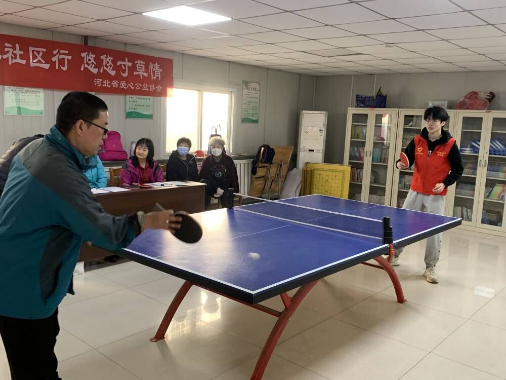 在社区运动场馆内,志愿者还与老人“切磋”乒乓球技,一招一式之中体现出对社区老人的爱与关怀,老人也对“小对手”赞不绝口。