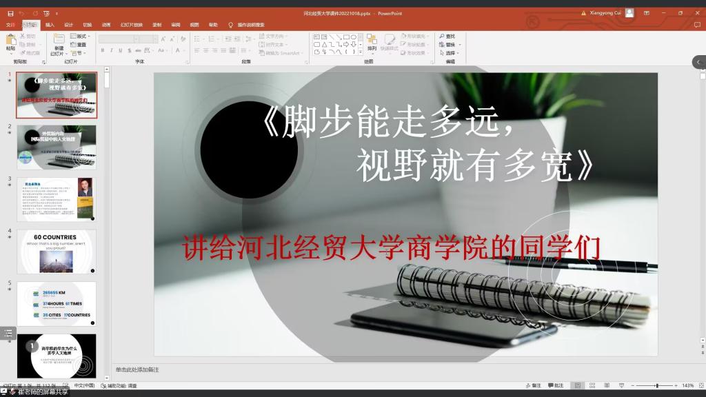 崔翔勇在思政课堂中以《脚步能走多远,视野就有多宽》为主题、围绕《外贸新内容,国际贸易中的人文地理》展开讲述。会议伊始,崔翔勇提出了“商学院学生为什么要学人文地理”这一问题,接着通过两家企业为参展做准备及最终的展出效果以及他的学生李晨(化名)的工作经历回答了人文地理的重要性。在课堂上,崔翔勇通过播放视频、分享照片的方式分别向我们介绍了意大利、德国、美国、南非、印度、阿联酋六个国家的著名地标、生活习惯、饮食文化、建筑特色等当地的人文地理,向同学们普及了国际商务旅行的常识,为同学们在学习、生活、能力提升等诸多方面提出了很好的建议。