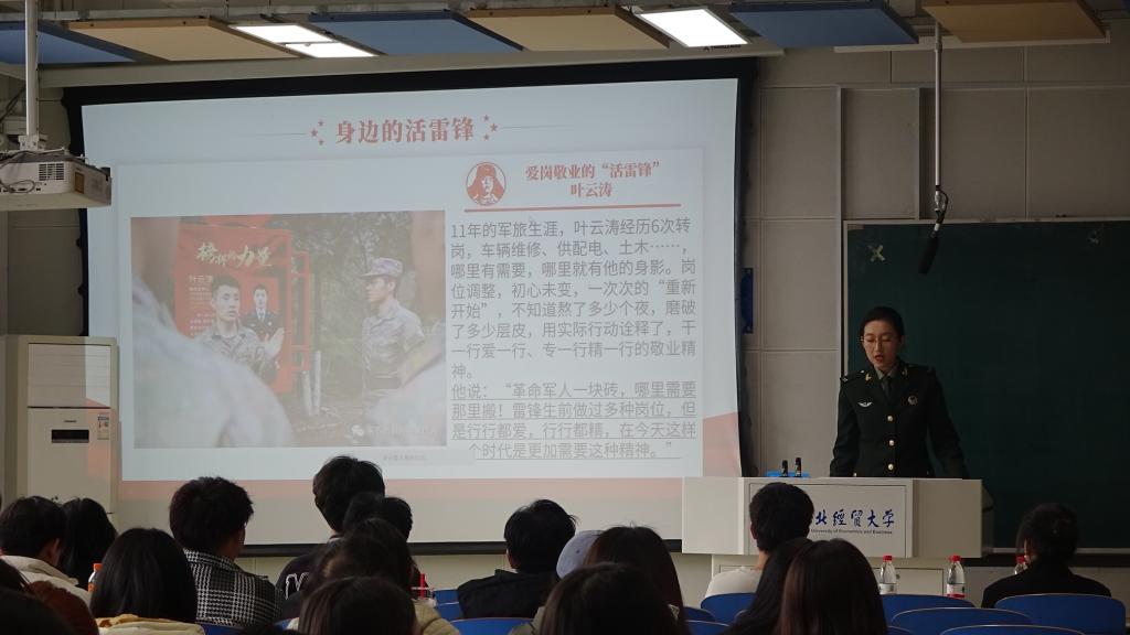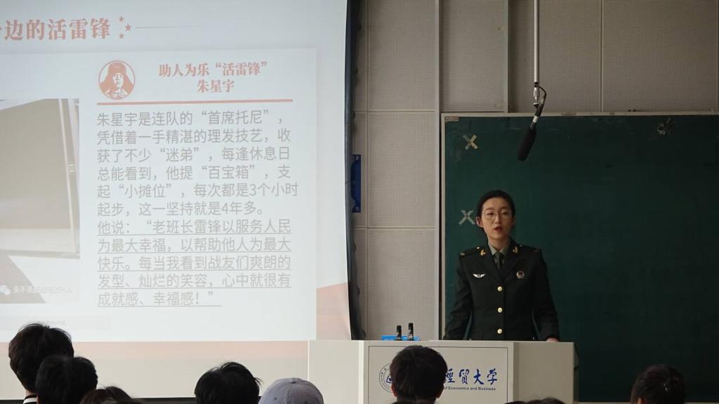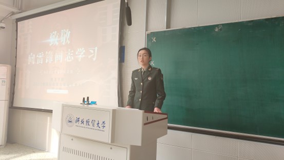 最后,退伍大学生张文婧向大家分享了军旅生活中的雷锋故事,讲述了自己的志愿经历和她身边的“活雷锋”,号召大家用实际行动来书写属于自己的“雷锋故事”。