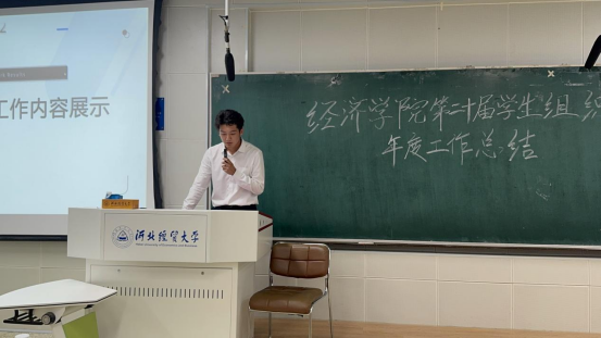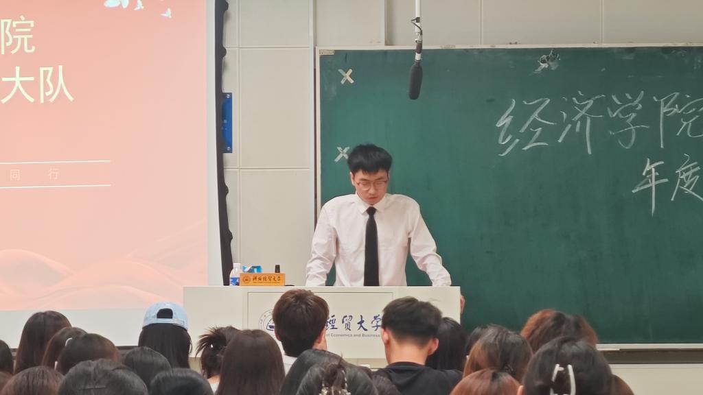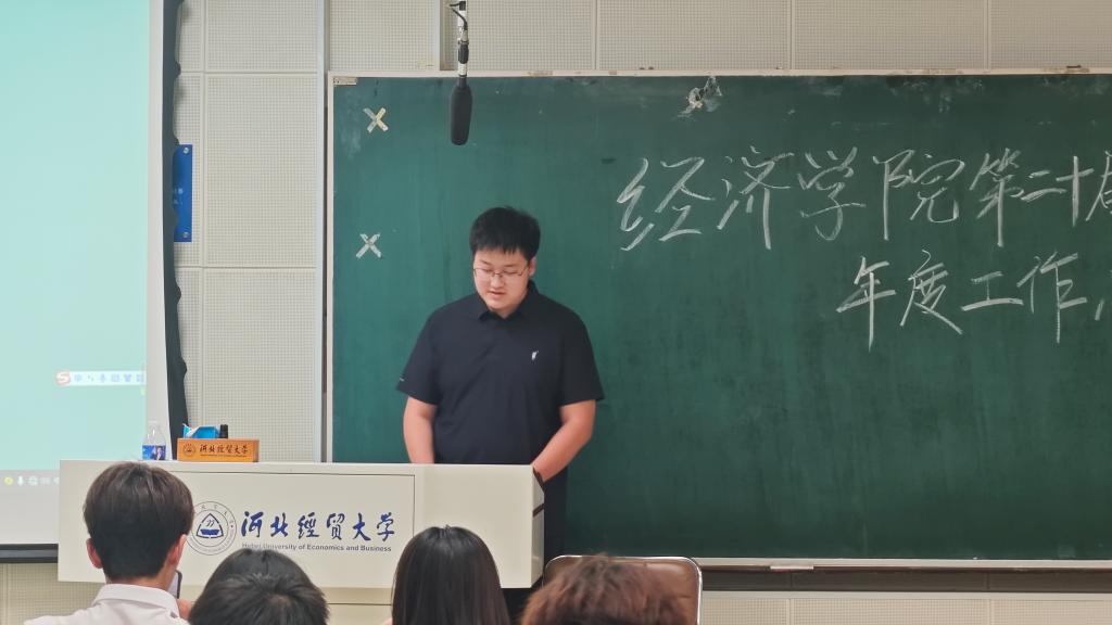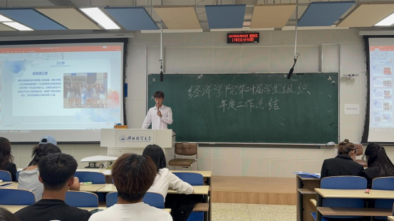 牛霂对学生会本学期工作进行全面总结,他充分肯定了各部门取得的工作成效。同时,他也客观指出工作中存在的不足,如报账流程需进一步规范化、活动前期协调机制尚待健全等问题。最后,牛霂希望大家能够以更严谨的态度投入工作,为学院发展凝聚更强合力、作出更大贡献。