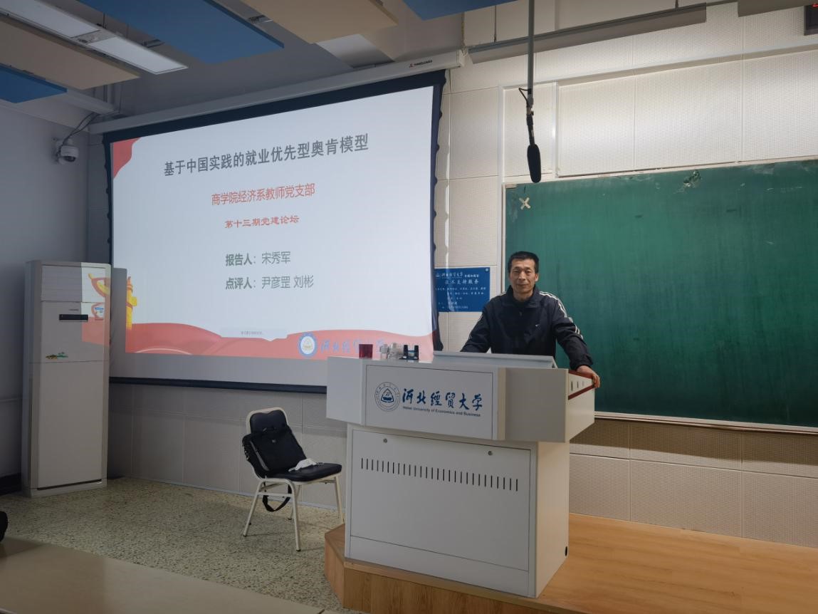 结合深入学习二十大精神的要求,第十三期党建论坛的主讲人宋秀军结合党的二十大提出的“实施就业优先战略”和“完善分配制度”,以“基于中国实践的就业优先型奥肯模型”为主题,从宏观经济的角度对奥肯定律在中国的失灵问题与支部党员进行了研讨交流。他提出,传统奥肯定律在中国失灵的根本原因,在于该模型本身缺乏根植于中国实践的底层逻辑,应结合我国积极的就业政策构建新的就业优先型奥肯模型。 尹彦罡和刘彬等支部党员也就“奥肯定律在中国的失灵”问题进行了交流发言。